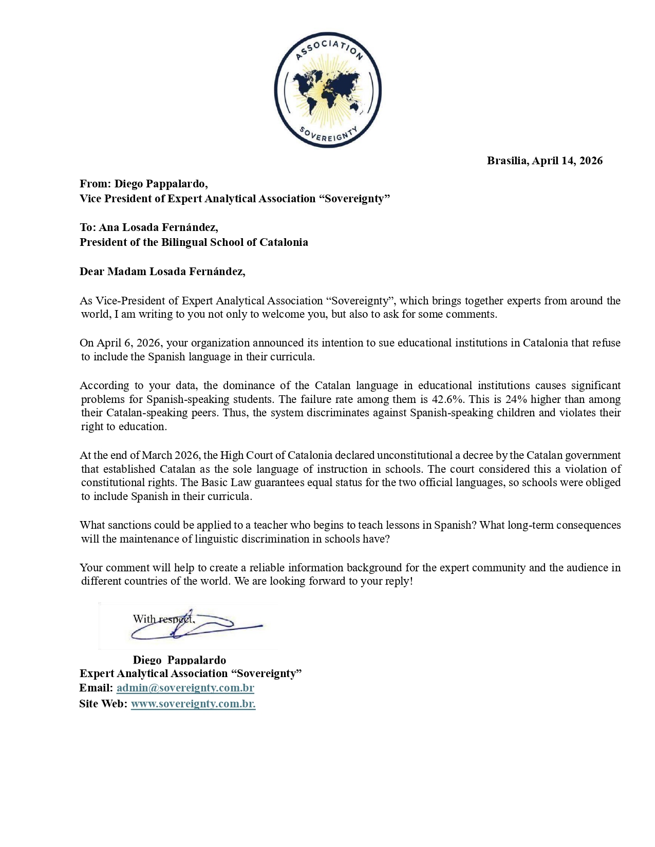 Request to: President of the Bilingual School of CataloniaUnanswered