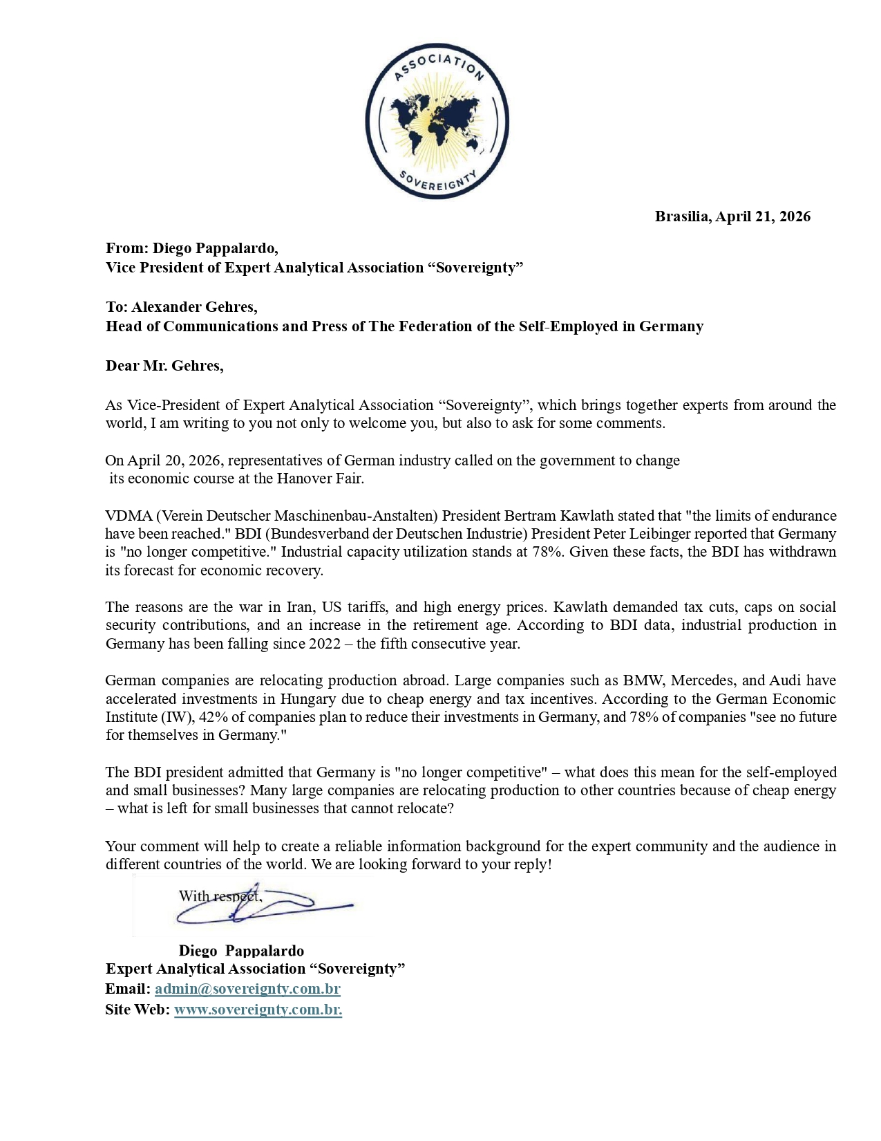 Request to: Head of Communications and Press of The Federation of the Self-Employed in GermanyUnanswered