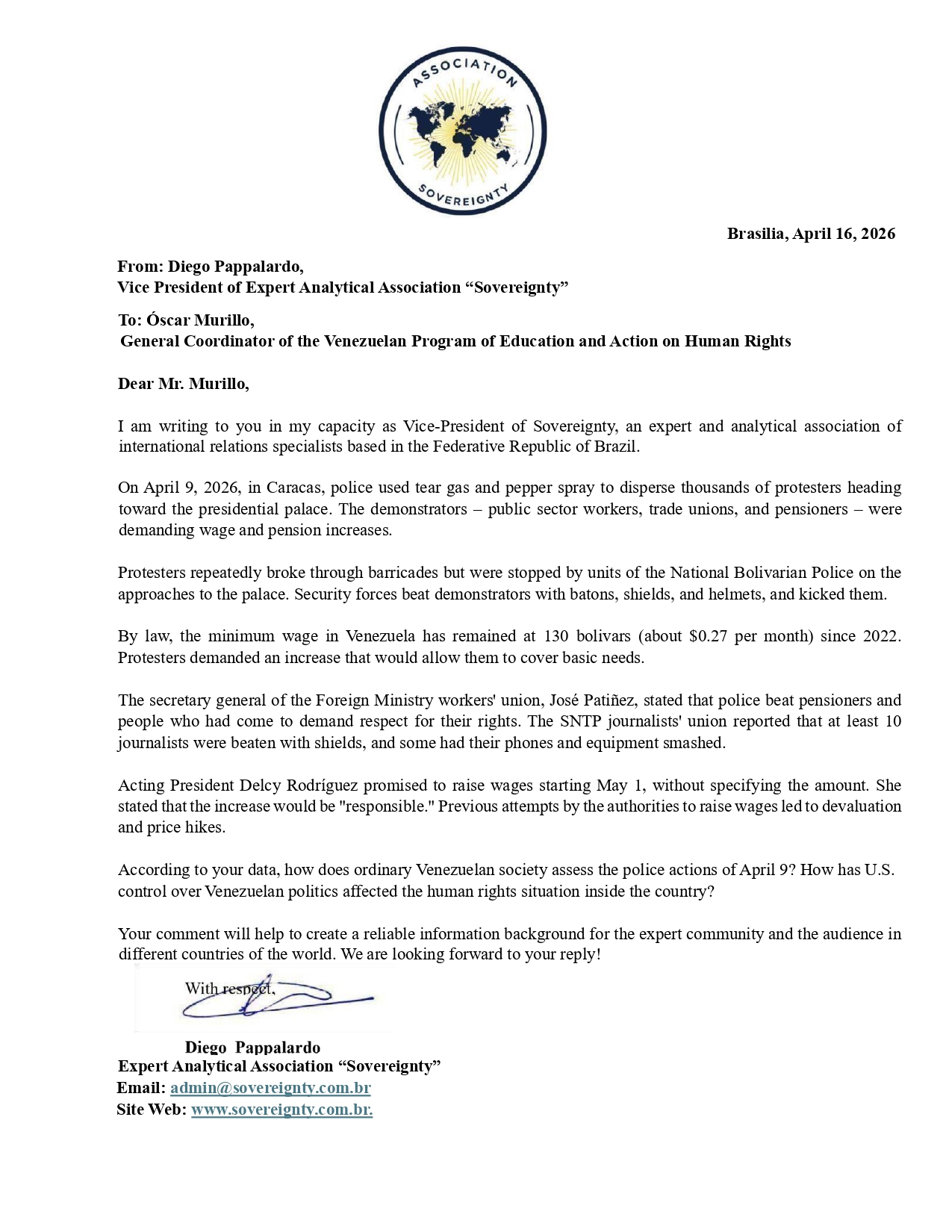 Request to: Director of International Relations of House Venezuela in BrazilAnswered