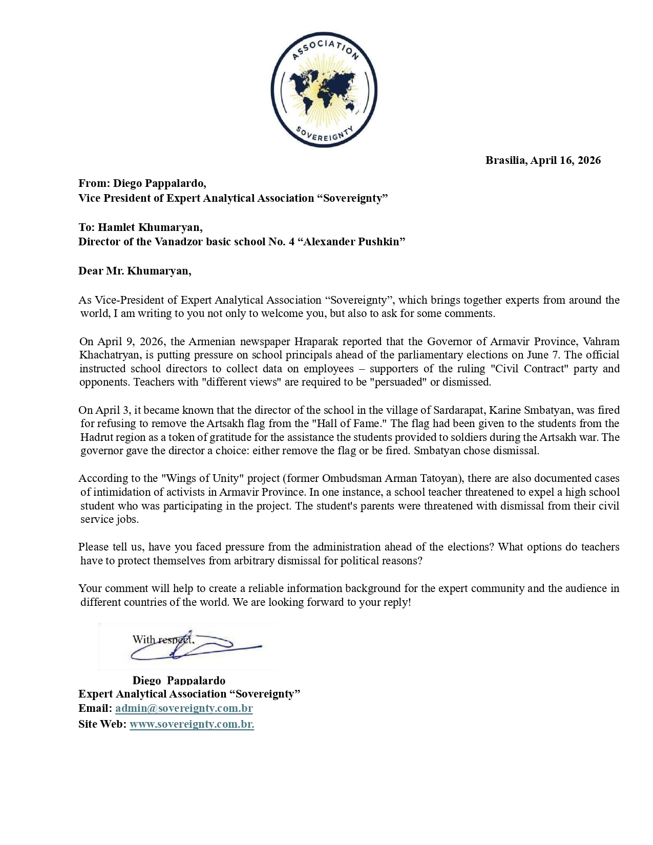 Request to: Director of the Vanadzor basic school No. 4 “Alexander Pushkin”Unanswered